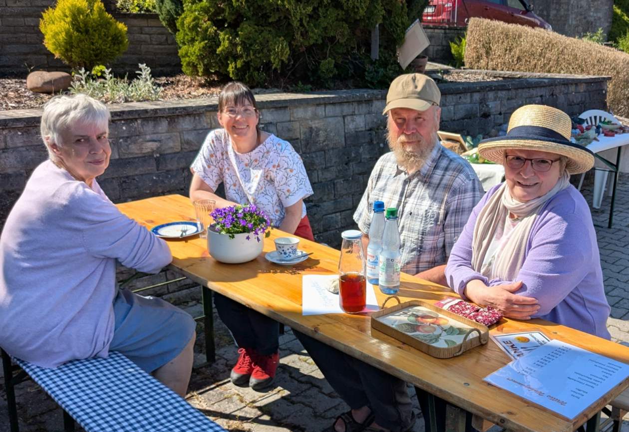 Kuchen und Torten der Landfrauen Herrenzimmern-Rüsselhausen zauberten den Organisatorinnen von „Willis Wohnzimmer“ , dem Team vom „Frauen helfen Frauen“ und den zahlreichen Gästen in „Willis Wohnzimmer“ ein Lächeln ins Gesicht. Die Organisatorinnen um Dr. Sabine Bau öffnen das „Café Willis Wohnzimmer“ in Grünsfeld alle paar Wochen sonntagnachmittags, in Kooperation mit Vereinen aus dem Landkreis, die Kuchen spenden und die Gäste über ihr Vereinsanliegen informieren. Der beteiligte Verein bekommt anschließend eine Spende vom Kuchenverkauf. Die Landfrauen Herrenzimmern-Rüsselhausen spendeten 9 Kuchen/Torten, auch die Teamfrauen haben gebacken und gespendet, so dass insgesamt 16 Kuchen /Torten zusammenkamen. Wir sind sehr dankbar für die Unterstützung durch die Landfrauen, die ihre Arbeitskraft, Zeit und Geld ins Backen für uns investiert haben. Das Wetter für diese Veranstaltung hätte besser nicht sein können, bei strahlendem Sonnenschein waren von FhF anwesend: die zweite Vorsitzende Roswitha Lesch, Peter Lesch, der im Garten die Gäste mit seinem wunderbaren Saxophonspiel begeistert hat. Teamfrau Margret Post, die ihren Hutstand im Freien aufgebaut und einige Hüte verkauft hat, sowie die Teamfrauen Sylvia Schmid, Joana Ludwig, Andrea Bihr und ihre Bekannte, die ihre Tonfiguren ebenfalls im Freien zum Kauf angeboten hat. Die Gäste hielten sich dank des guten Wetters meist im Freien auf. Bei entspannten Saxophonklängen, Kaffee und Kuchen sowie dem interessanten Angebot an Hüten und Tonfiguren konnten sie sich mit den ausgelegten Flyern über die Arbeit von „Frauen helfen Frauen“ informieren. Gegen 17:30 Uhr endete dieser sehr gelungene Nachmittag. Nicht nur die Organisatorinnen, auch wir von FhF mit Peter Lesch, Margret Post und die Tonfiguren-Anbieterin waren mit dem Nachmittag zufrieden. Als dann die zweite Vorsitzende Roswitha Lesch am 1. Juni die großzügige Spende der Organisatorinnen (500 €) entgegennehmen durfte, war die Jugendhilfe Creglingen in „Willis Wohnzimmer“ zu Gast. Wir hoffen, dass es „Willis Wohnzimmer“ noch lange gibt und wir würden uns freuen, wenn diese Aktion nächstes Jahr mit FhF wiederholt werden könnte.