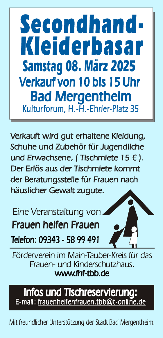 Am internationalen Frauentag, fand mit freundlicher Unterstützung der Stadt Bad Mergentheim von 10 bis 15 Uhr wieder unser Secondhand-Kleiderbasar im Kulturforum statt. Auch hier kam der Erlös aus der Tischmiete unserer Arbeit für Frauen zugute.