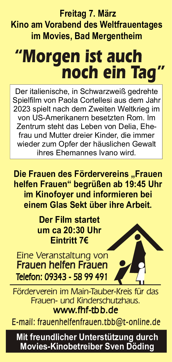 Am Vorabend des internationalen Frauentages zeigten wir in Zusammenarbeit mit dem Kinobetreiber Sven Döding im Bad Mergentheimer “Movies“ den italienischen Spielfilm „Morgen ist auch noch ein Tag“ (Originaltitel: C’è ancora domani).