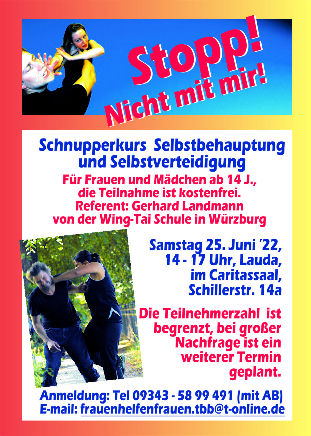 Ein Schnupperkurs „Selbstbehauptung und Selbstverteidigung“ mit Gerhard Landmann von der Wing-Tai Schule in Würzburg findet am Samstag, 25. Juni, von 14-17 Uhr in Lauda im Caritassaal, Schillerstraße 14a statt.